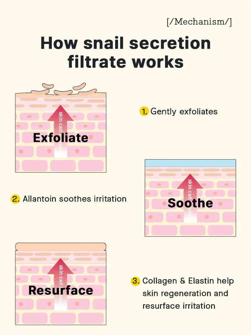 96.3% of Snail Secretion Filtrate helps protect the skin from moisture loss while improving skin elasticity. Snail mucin helps repair and soothes red, sensitive skin after breakouts by replenishing moisture.