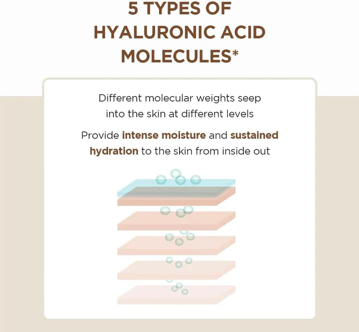 Deep Hydration: 5 hyaluronic acid molecules layer moisture from within.